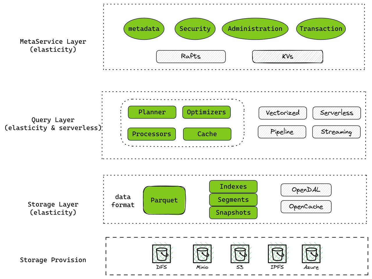 Databend is architecturally divided into three layers: Meta Service Layer, Query Layer, and Storage Layer.